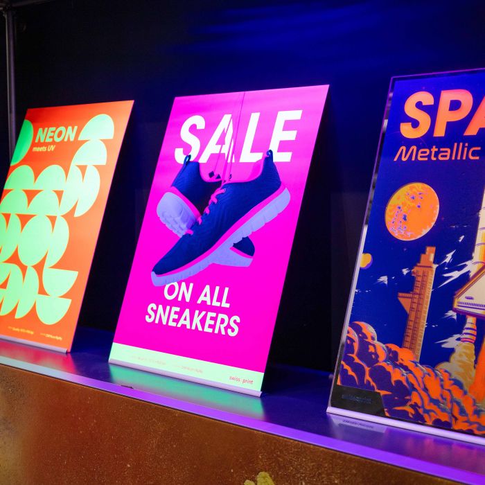 Neon Print is een printoptie met fluorescerende neonkleuren die jouw ontwerp extra fel en energiek laat opvallen. Dankzij de neoninkten springen jouw visuals direct in het oog en trekken ze meer aandacht dan gewone kleuren, wat zorgt voor krachtige communicatieresultaten in winkels, events, campagnes en promoties. Neon Print werkt bijzonder goed onder blacklight of UV-licht en kan op diverse materiaalsoorten worden toegepast voor creatieve en opvallende visuals.